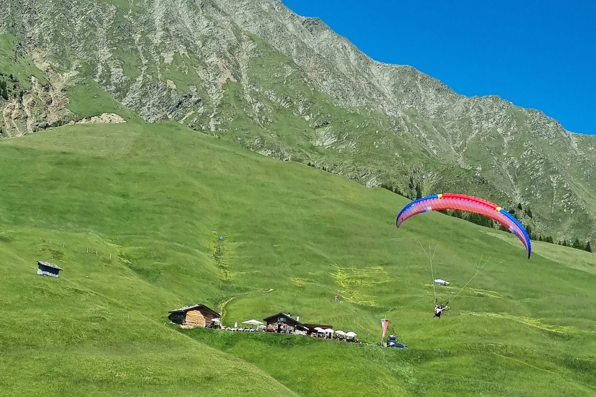 Hinweis: Sollte das Einlanden auf der Hütte aufgrund zu starker Thermik nicht möglich sein, fliegen wir ohne Zwischenlandung ins Tal. Sicherheit steht bei uns an erster Stelle!